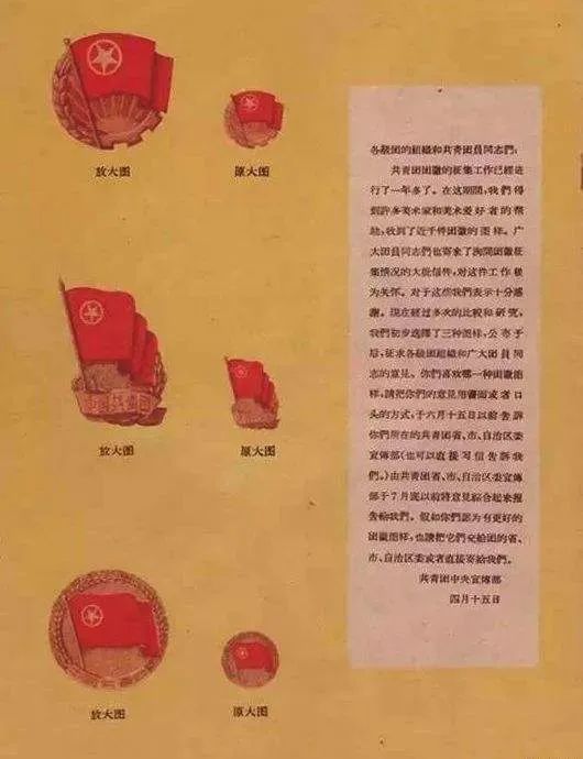 1949年4月,中国新民主主义青年团第一次全国代表大会结束后,团中央根据代表们的要求,做出了制定团旗、团徽、团歌的决定,并且在当年5月15日的《人民日报》上刊登了征求团旗、团徽、团歌的启事。