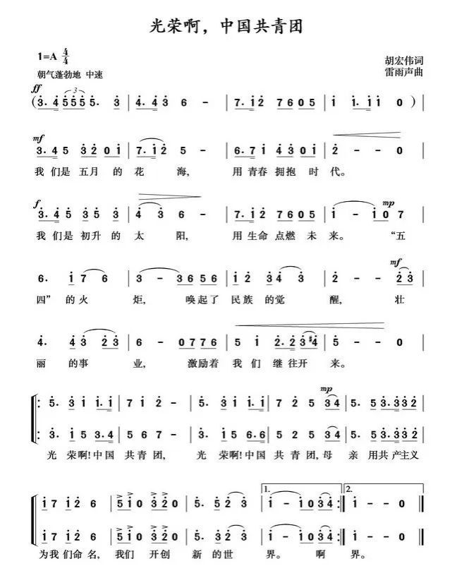 当年55岁的雷雨声担任辽宁歌剧院副院长兼辽宁乐团团长。他对《光荣啊,中国共青团》的词“一见钟情”。“胡宏伟写下的歌词让我看第一眼就喜欢上了。真是好词啊!大气磅礴,看了让人心潮澎湃。”他当场决定为这首词谱曲。
